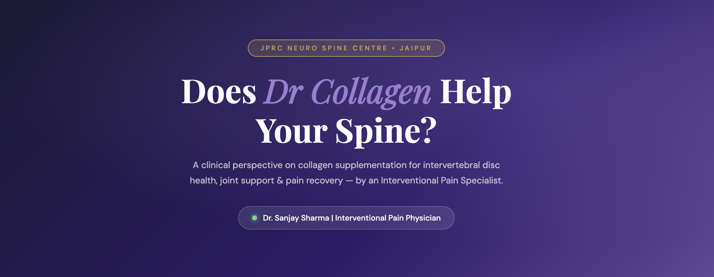 "In my practice at JPRC, I see many patients with degenerative disc disease, cervical spondylosis, and chronic joint pain. Collagen supplementation is not a cure — but as part of a comprehensive pain management plan, it supports the very structural proteins that hold our spine together. I recommend it especially post-intervention to support long-term tissue recovery."